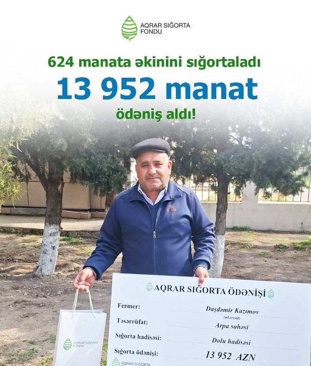 Fermer Daşdəmir Kazımov 2025-ci ildə 15 hektar arpa sahəsini sığortalayıb və bunun üçün 624 manat sığorta haqqı ödəyib.