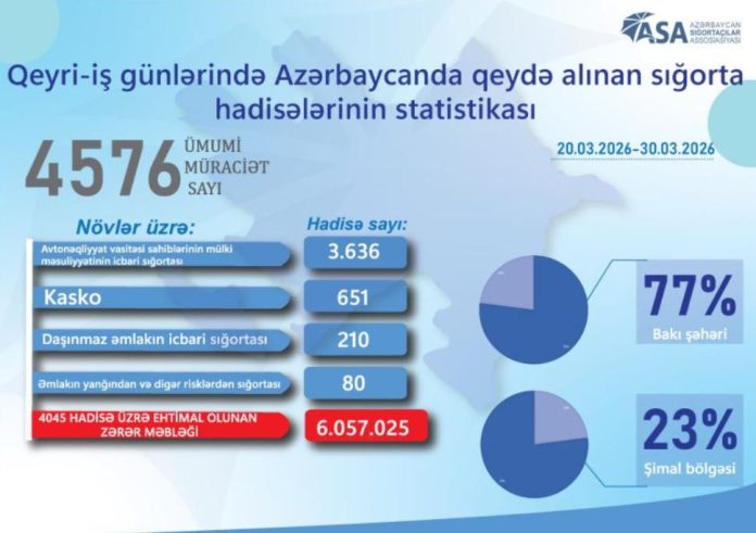 Azərbaycan Sığortaçılar Assosiasiyası nın yerli sığorta bazarı iştirakçılarından aldığı bu günə olan son dəqiq məlumatlara görə, 20-30 mart 2026-cı il tarixlərdə baş vermiş sığorta hadisələri ilə bağlı 8 qeyri-həyat sığorta şirkətinə ümumilikdə 4576 sığortalı müraciəti daxil olub. Bu müraciətlərin 3636-sı “Avtonəqliyyat vasitəsi sahiblərinin mülki məsuliyyətinin icbari sığortası” növü, 651-i “Kasko” (“Avtonəqliyyat vasitələrinin sığortası”) sığorta növü, 210-u “Daşınmaz əmlakın icbari sığortası” növü, 80-i isə “Əmlakın yanğından və digər risklərdən sığortası” növü üzrə baş vermiş sığorta hadisələri ilə bağlı olub.